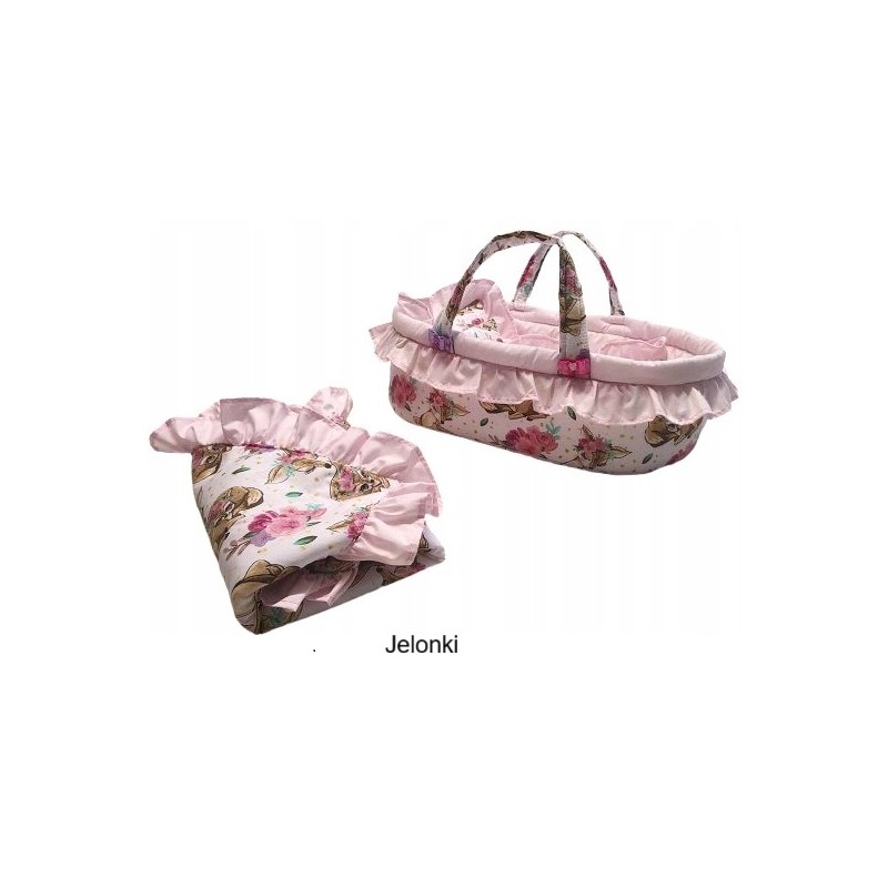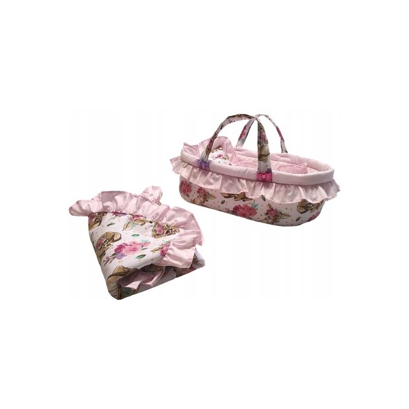 Nosidełko z pościelą i falbankami to idealny prezent dla małej księżniczki, która uwielbia opiekować się lalkami.