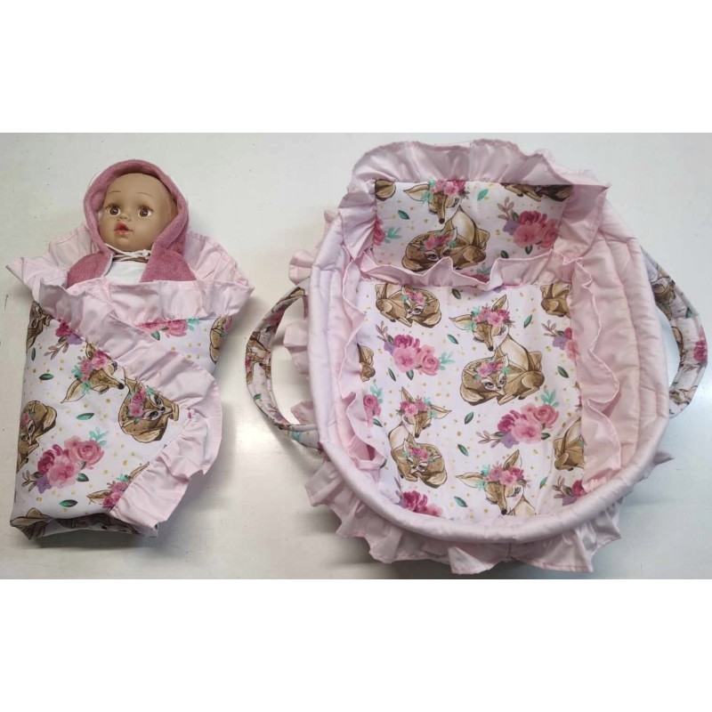 Przedstawiamy Państwu nosidełko dla lalki z pościelą oraz rożkiem ozdobione piękną falbanką, które zostało uszyte przez nas z najwyższej jakości bezpiecznych materiałów z niezwykłą starannością.