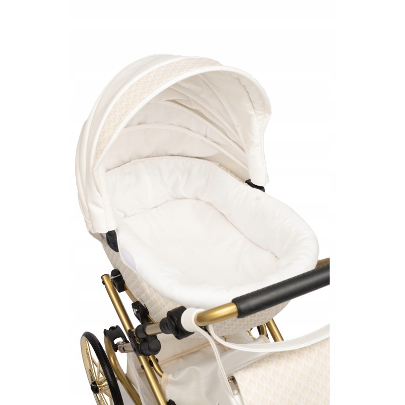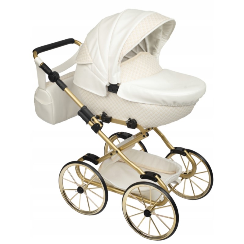 Przedstawiamy Państwu: Duży wózek głęboki Retro dla lalek Darsi biały na złotym stelażu, który został wyprodukowany w naszej firmie z najwyższej jakości bezpiecznych materiałów z niezwykłą starannością.
