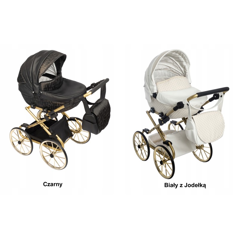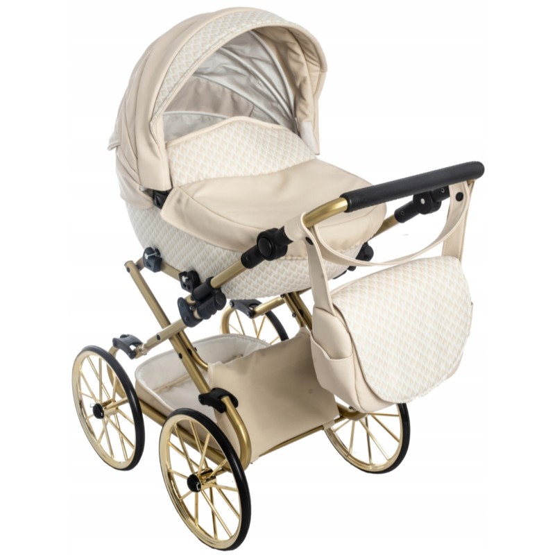 Przedstawiamy Państwu: Duży wózek głęboki Retro dla lalek Darsi biały na złotym stelażu, który został wyprodukowany w naszej firmie z najwyższej jakości bezpiecznych materiałów z niezwykłą starannością.