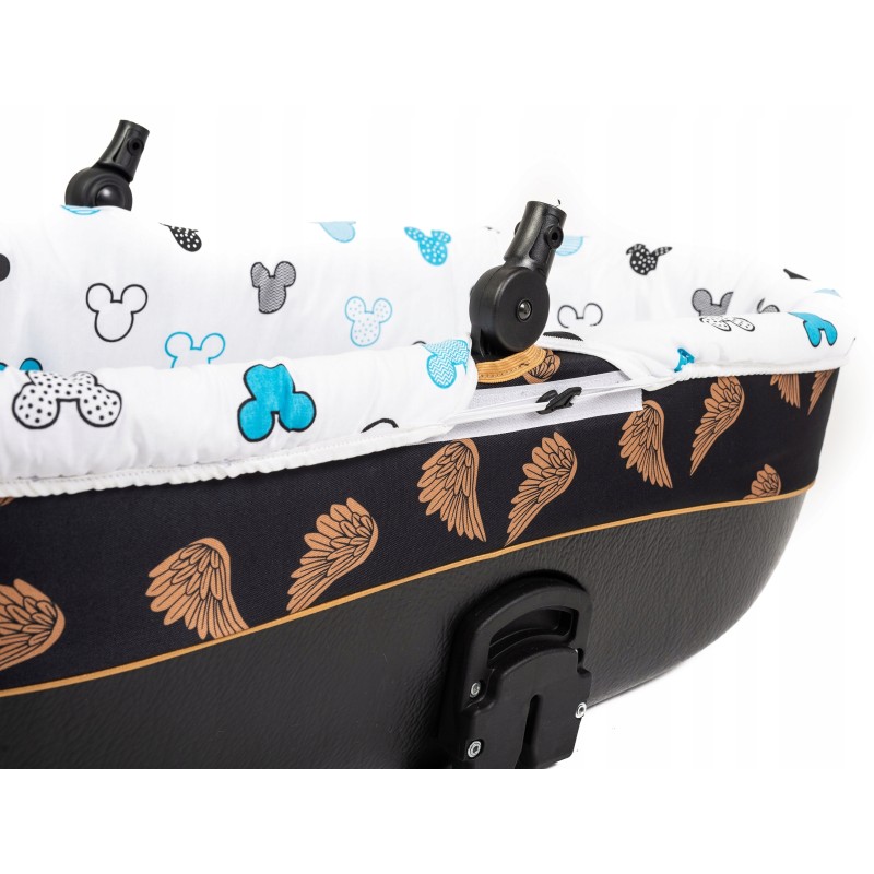 • Wykładka jest wypełniona antyalergiczną owatą o gramaturze 150 g/m2 co sprawia że jest miękka , ciepła i miła w dotyku, natomiast materac warstwą pianki o grubości 0,8 mm i warstwą ocieplacza o gramaturze 150 g/m2 co daje razem grubą i  i mięciutką warstwę izolującą dziecko od dna gondoli wózka .