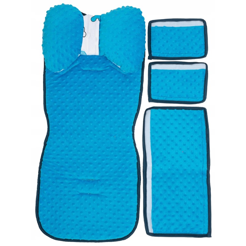 Dwustronna wkładka do wózka spacerowego wykonana z BAWEŁNY 100% w różnych wzorach i kolorach, z drugiej strony połączona z tkaniną MINKY Z BĄBELKAMI. W środku wypełniona mięciutkim ocieplaczem, można używać ją obustronnie.