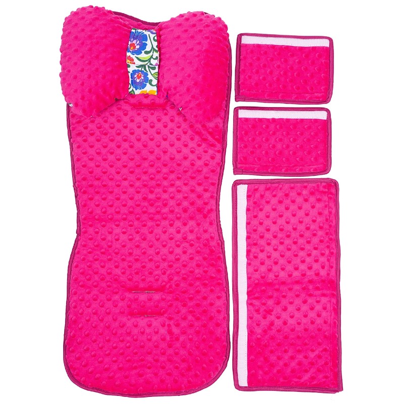 Dwustronna wkładka do wózka spacerowego wykonana z BAWEŁNY 100% w różnych wzorach i kolorach, z drugiej strony połączona z tkaniną MINKY Z BĄBELKAMI. W środku wypełniona mięciutkim ocieplaczem, można używać ją obustronnie.