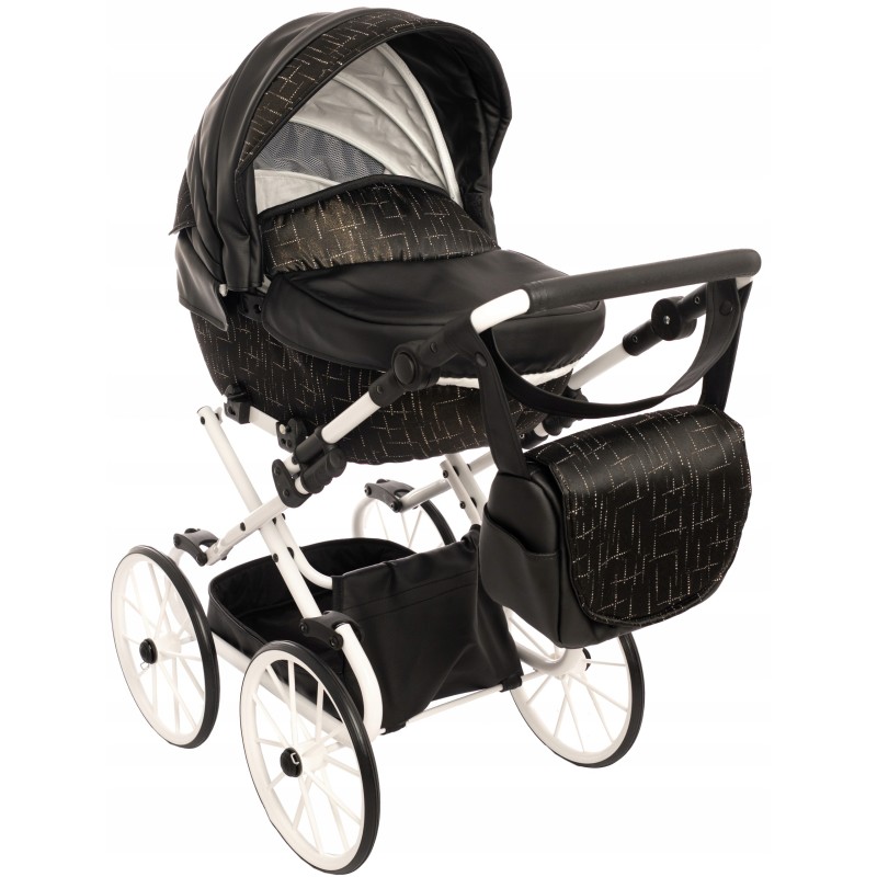 Przedstawiamy Państwu: Duży wózek głęboki Retro dla lalek Darsi w kolorze czarnym na białym stelażu, który został wyprodukowany w naszej firmie z najwyższej jakości bezpiecznych materiałów z niezwykłą starannością.