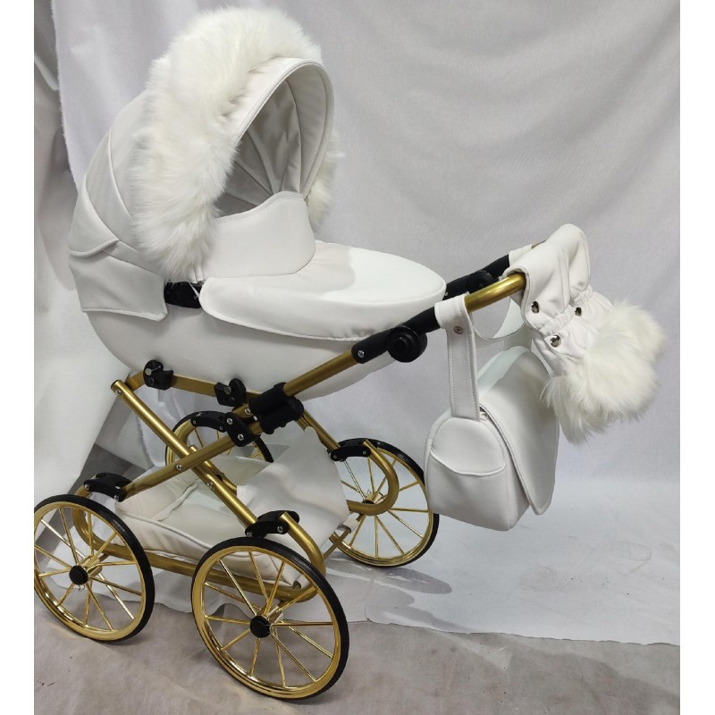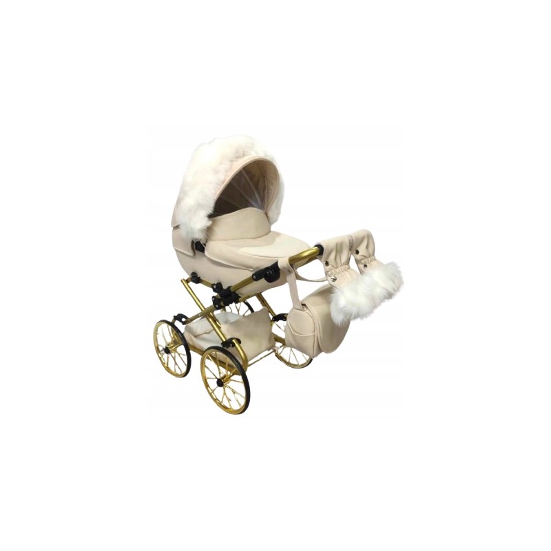 Przedstawiamy Państwu: Duży wózek głęboki Retro dla lalek Darsi na złotym stelażu, który został wyprodukowany w naszej firmie z najwyższej jakości bezpiecznych materiałów z niezwykłą starannością.