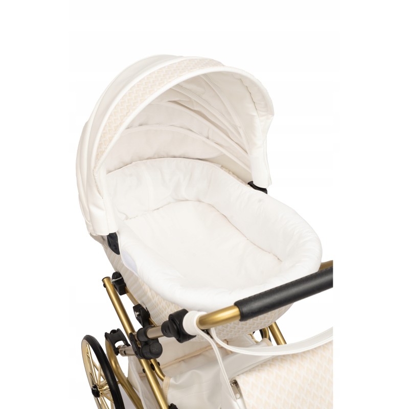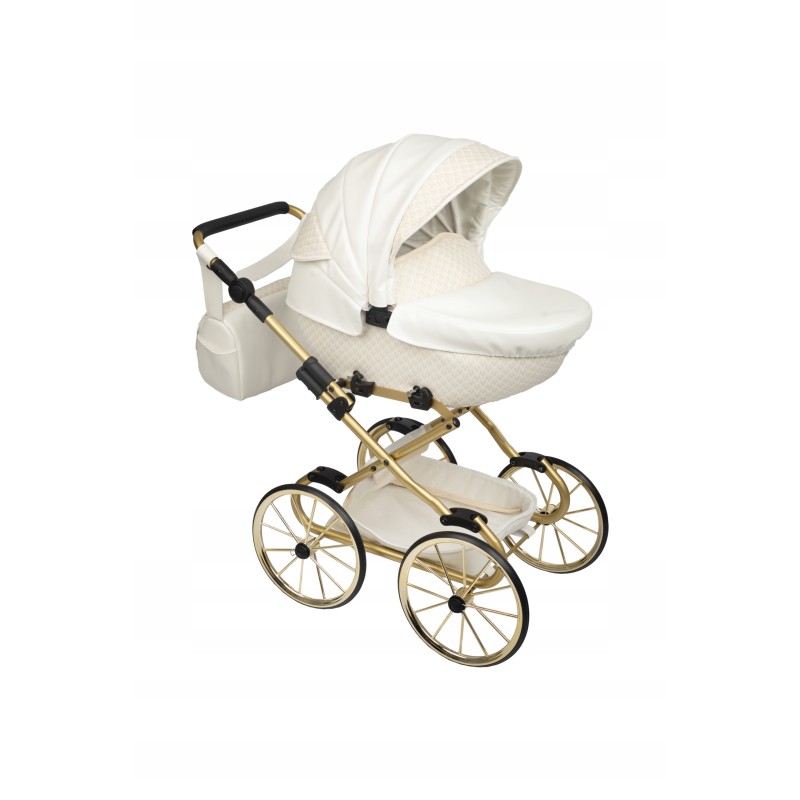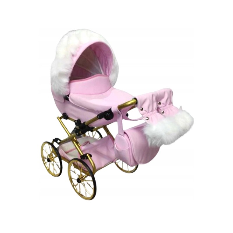 Przedstawiamy Państwu: Duży wózek głęboki dla lalek retro Darsi na złotym stelażu w kolorze różowym, który został wyprodukowany w naszej firmie z najwyższej jakości bezpiecznych materiałów z niezwykłą starannością.