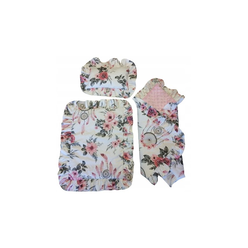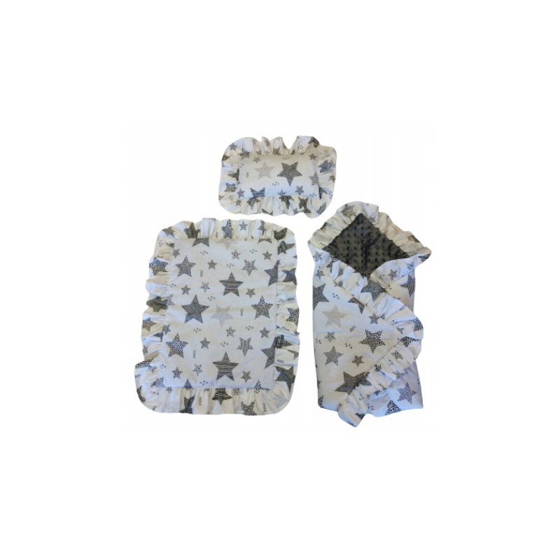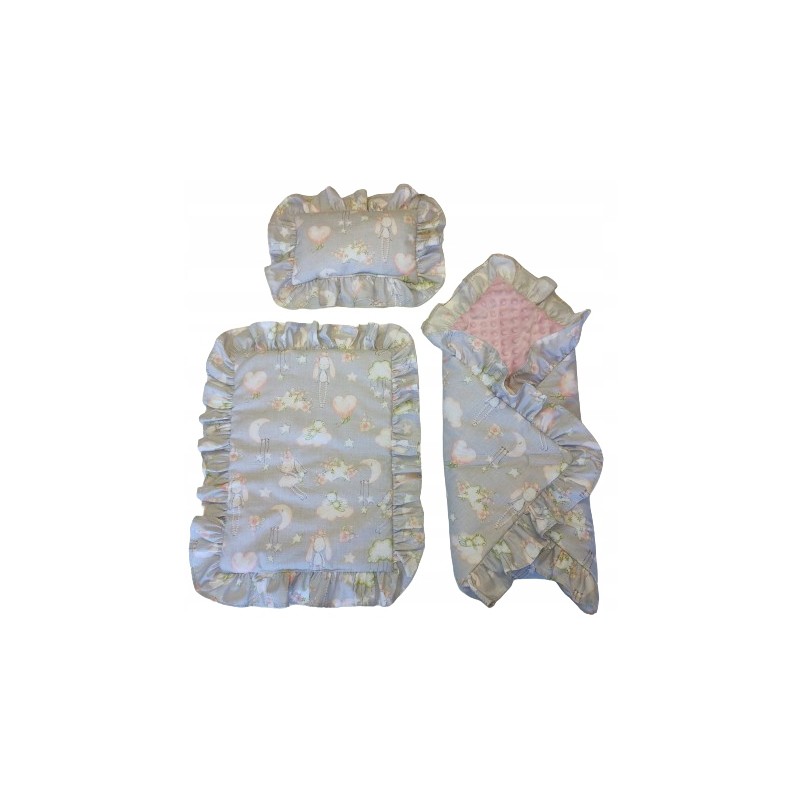 Przedstawiamy Państwu komplet pościeli dla lalki ozdobioną piękną falbanką, który został uszyty przez nas z najwyższej jakości bezpiecznych materiałów z niezwykłą starannością.