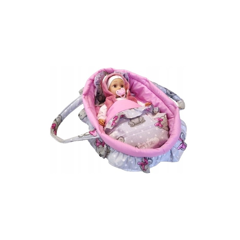 Nosidełko z pościelą i falbankami to idealny prezent dla małej księżniczki, która uwielbia opiekować się lalkami.