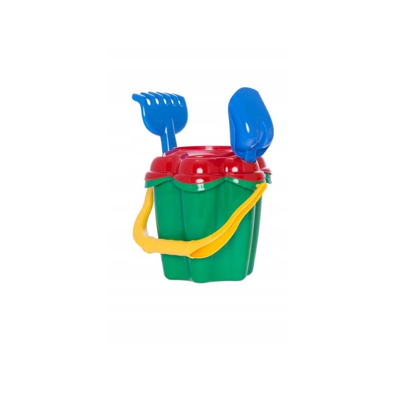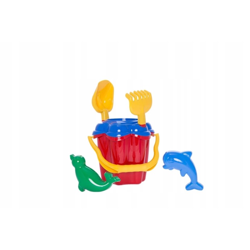 W zestawie znajduje się wiaderko „Kwiatek” z sitkiem, 2 foremki delfinek i foczka, łopatka oraz grabki. Nasz dzieciak na pewno nie będzie się nudził na plaży.