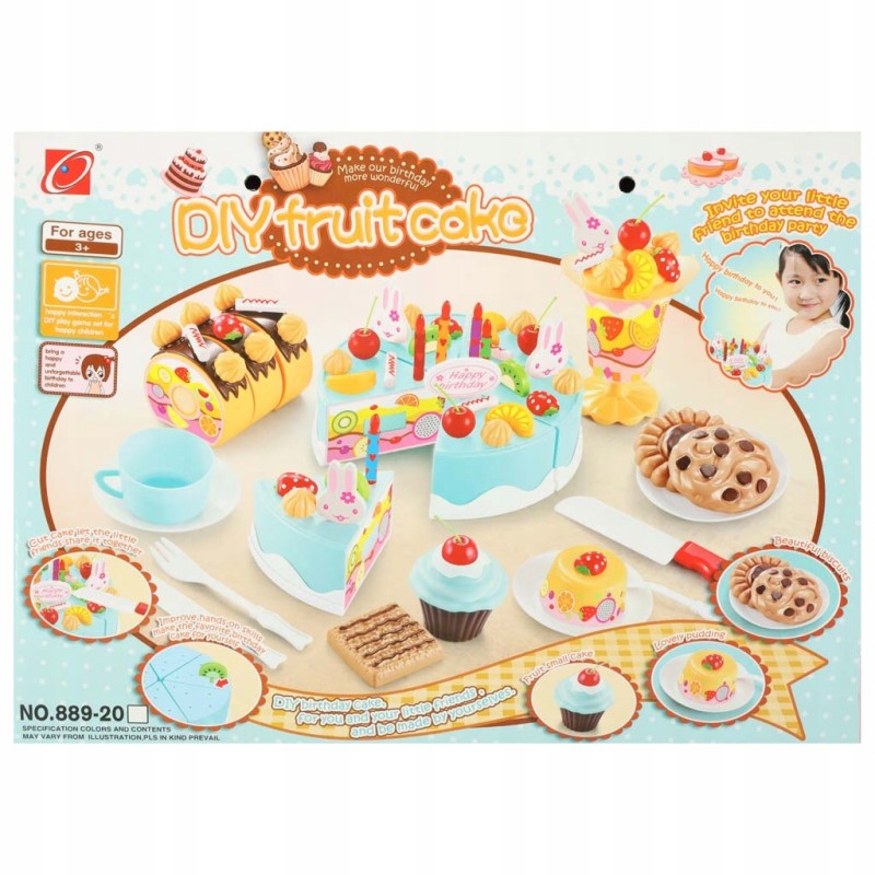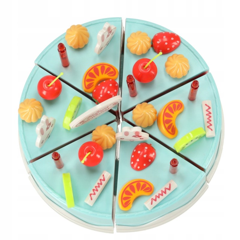 Piękny, kolorowy tort urodzinowy ze świeczkami i napisem. Tort składa się z 6 kawałków, które złączone są rzepami. Dziecko za pomocą plastikowego noża może pokroić tort. Dziecko może przybierać tort według własnego pomysłu. Duża liczba akcesoriów daje nieograniczone możliwość dla początkującego cukiernika. Zabawka korzystnie wpływa na wyobraźnię dziecka i zdolności manualne. Tort posiada dziurki umożliwiające jego dekorację. Produkt został zapakowany w estetyczne opakowanie, dzięki czemu świetnie sprawdzi się jako pomysł na prezent.