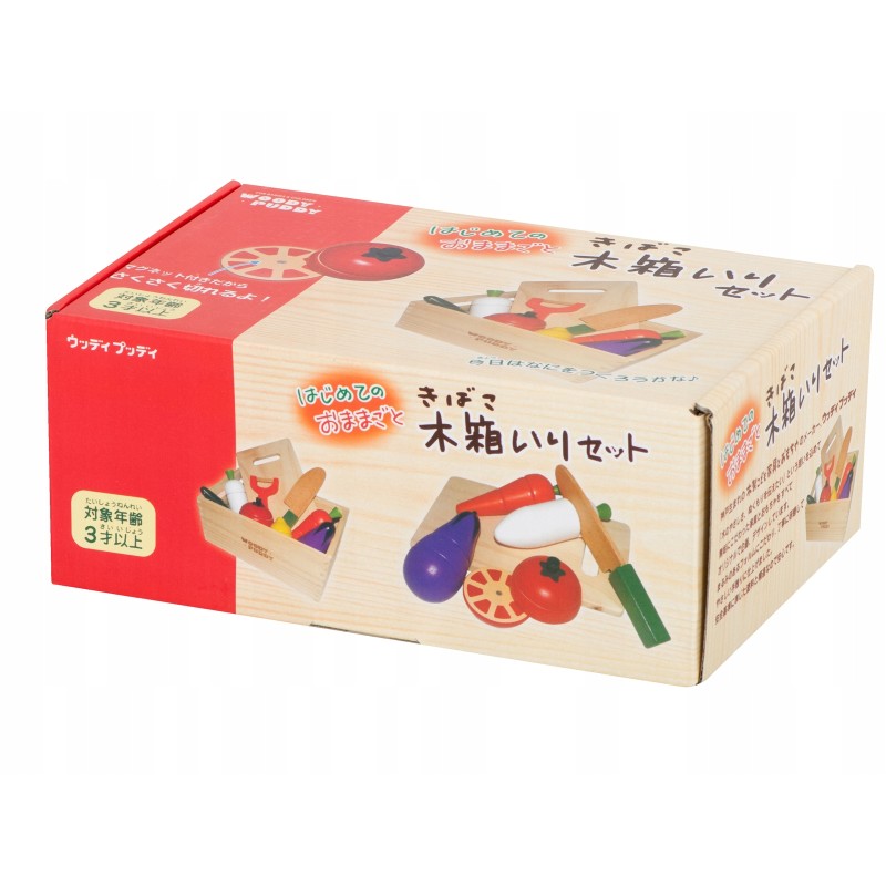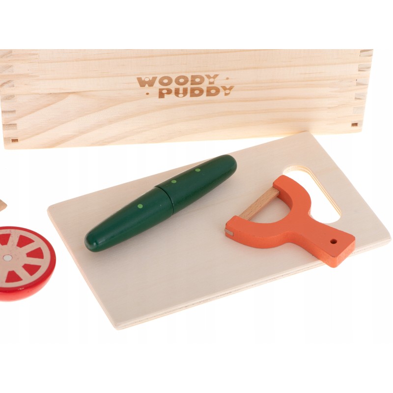 Kolorowe warzywa w drewnianej skrzynce, które pozwolą przygotować pyszny obiad dla wszystkich lalek i przytulanek.