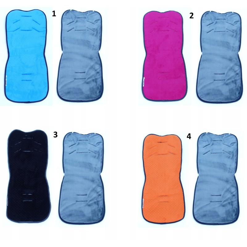 Dwustronna wkładka do wózka spacerowego wykonana z materiału NUBUK w różnych kolorach, z drugiej strony połączona z tkaniną MINKY. W środku wypełniona gąbką, można używać ją obustronnie. Materiał NUBUK jest bardzo dobrym materiałem, mocnym, wytrzymałym, swobodnie oddycha i przepuszcza powietrze, jest miękki i bardzo miły w dotyku. Materiał ten jest również używany w przemyśle samochodowym do tapicerek oraz foteli ale również w przemyśle meblarskim.